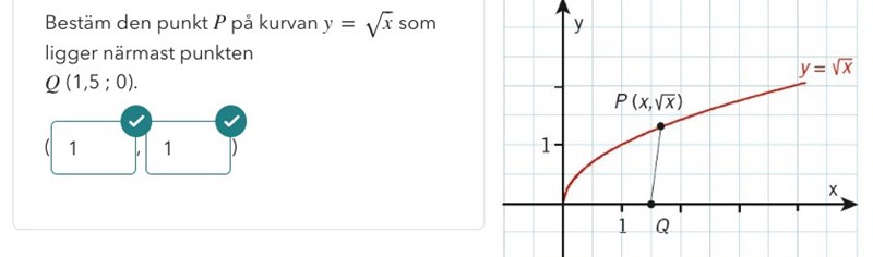Jag förstår att i den här uppgiften så ska man använda sig av pytagoras för att hitta hypotenusan som kommer att hjälpa oss hitta det minsta avståndet mellan punkterna genom att hitta där derivatan=0, men det jag inte förstå är när man ska hitta basen/kateten för triangeln varför man tar (x-1,5)^2 och inte (1,5-x)^2