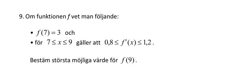 Om funktionens derivata är så stor som möjligt får man det största mäjliga värdet för f(9). Börja med att rita upp ett koordinatsystem där du markerar f(7) och den största och minsta möjliga derivatan för f'(x) i intervallet. Lägg upp din bild här.