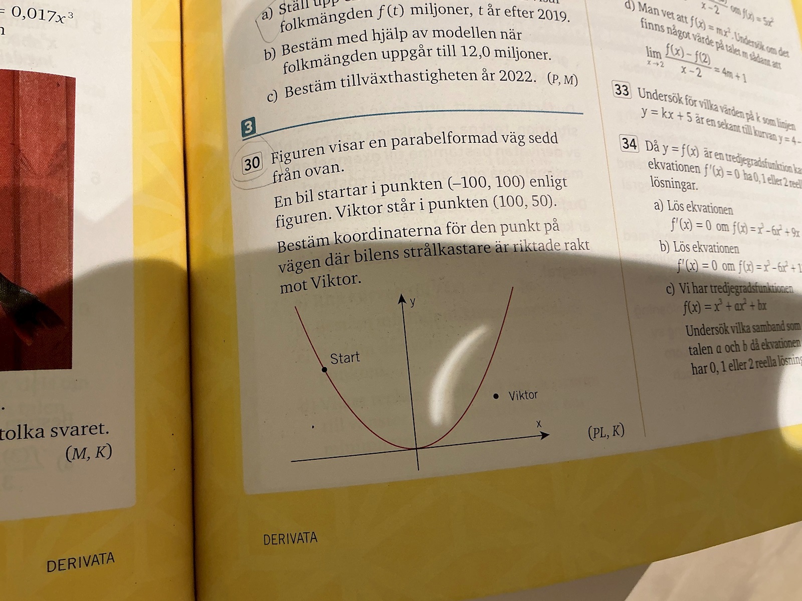 I denna uppgift vet jag att strålkastarna träffar Viktor då en tangent kan dras igenom kurvan och punkten (100, 50). Jag vet att funktionen är xˆ2 / 100 och dess derivata är x/50. Derivatan är även densamma som tangentens k värde. Jag har två punkter: 100, 50 och x, xˆ2/100. Hur skall jag gå tillväga sen? Jag har flertal gånger försökt göra ekvationssystem för att först lösa ut m och därefter sätta in (x, xˆ2/100) och lösa ut för x. Men jag lyckas inte.