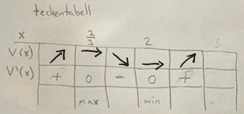 Om du vill göra en teckentabell så tycker jag att du ska rita in pilar som visar lutningen på V(x) och att du inte ska ha någon rad för.V''(x). Typ så här: