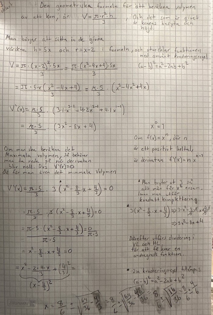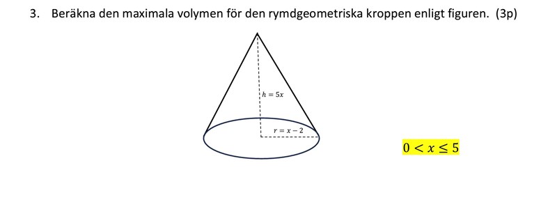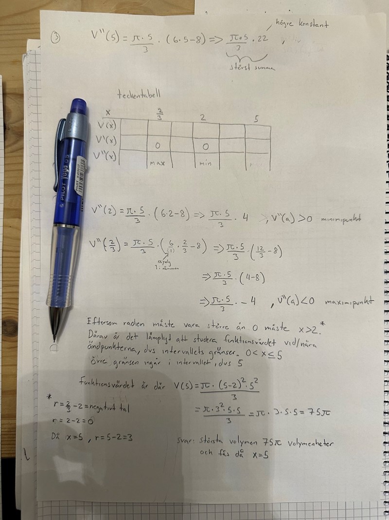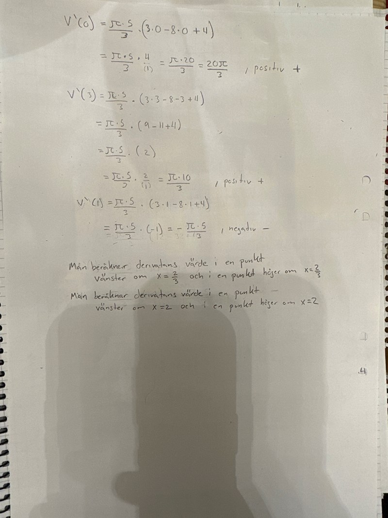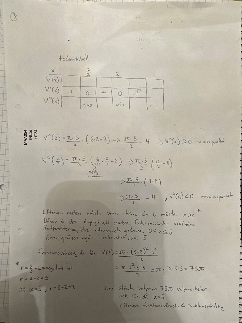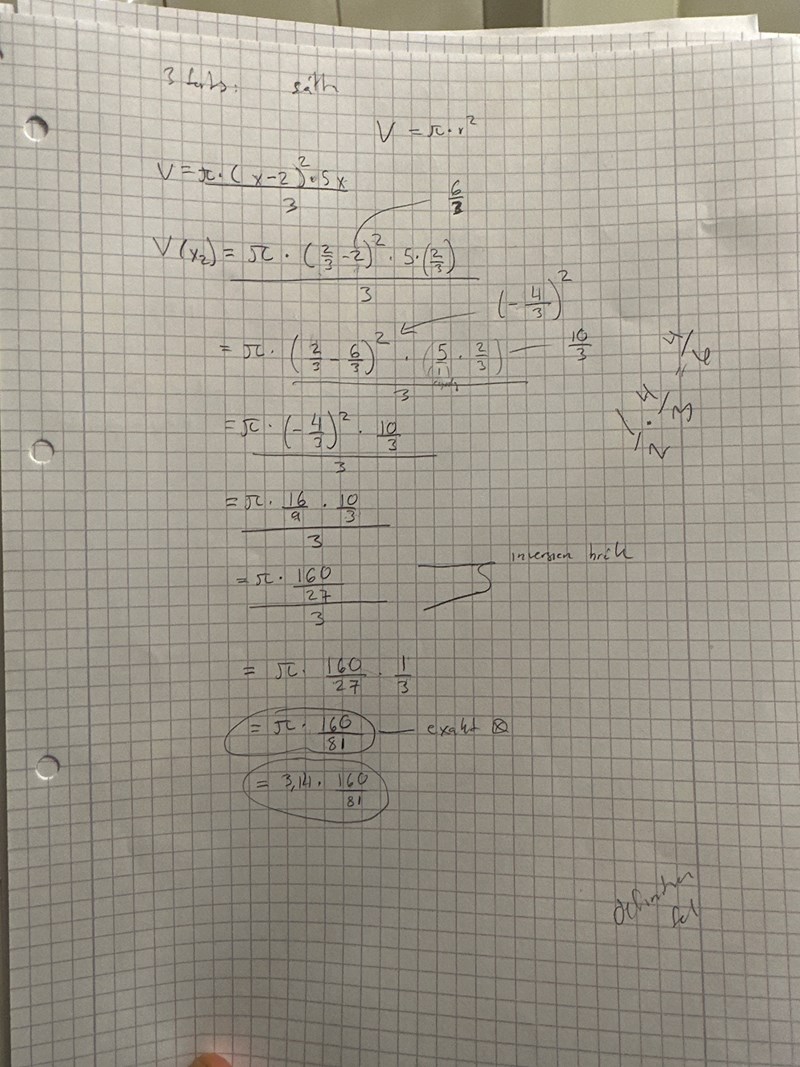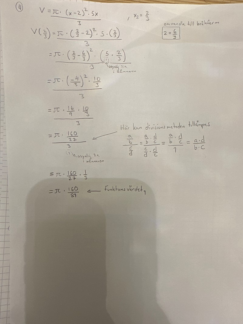 x= 2/3 så sätter man in det i originella funktionen V(x). Eftersom man inte får använda miniräknare så blir svaret exakta pi•(160/81).