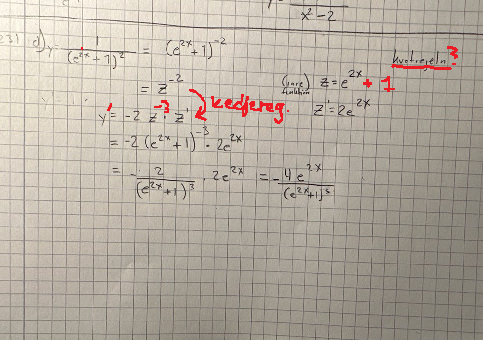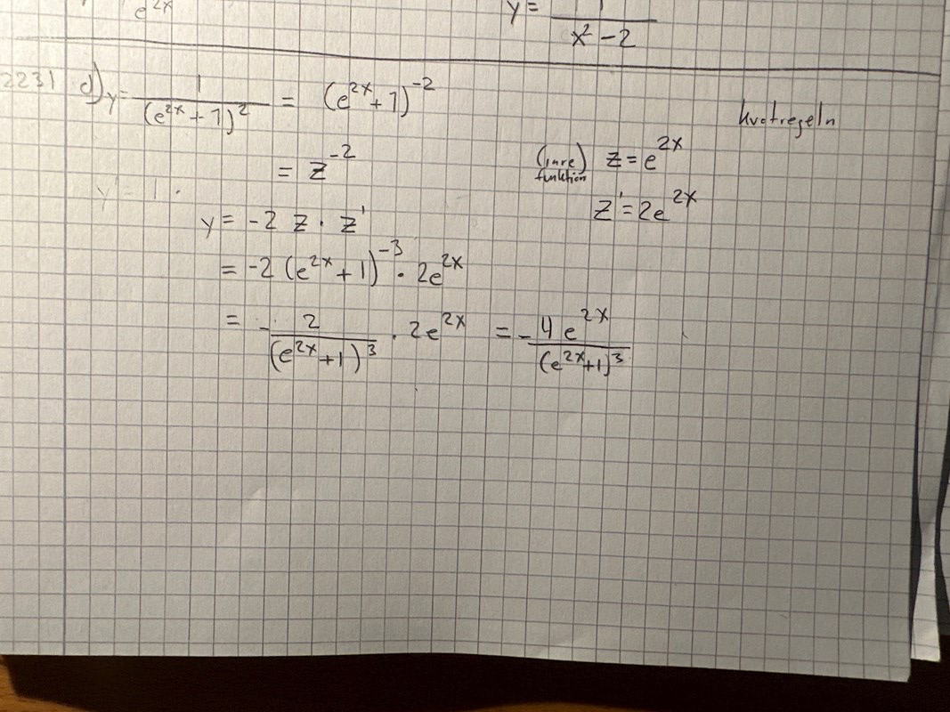 Kedjeregelns användning blir kanske tydligare om du ser uttrycket som y = (e^2x + 1)^(-2).