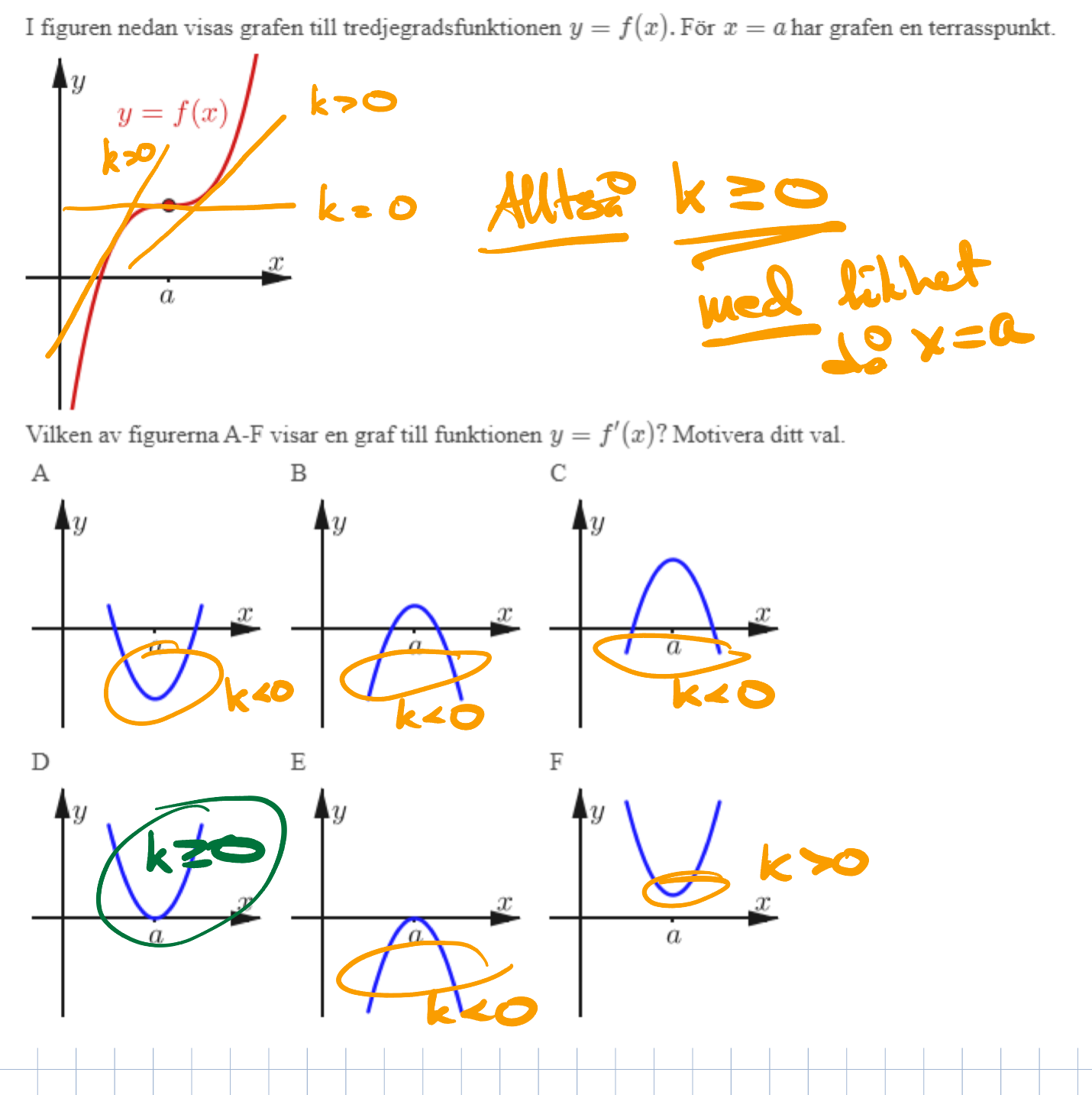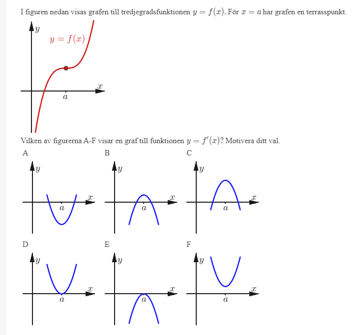 För grafen i uppgiften gäller att derivatan är positiv överallt utom i just terrasspunkten, där den är lika med 0.