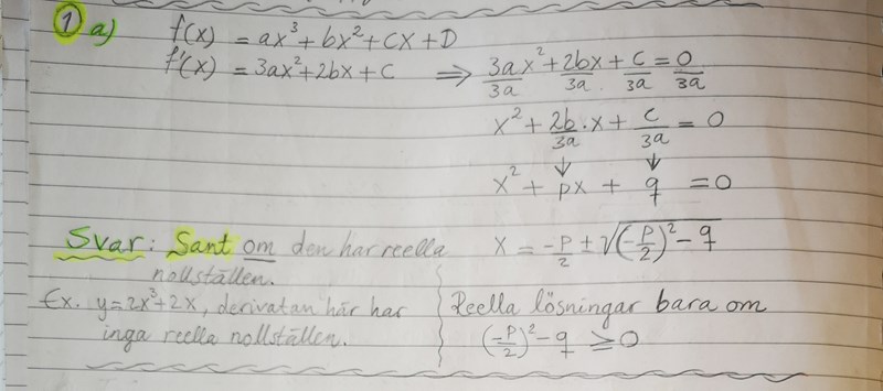 Att en tredjegradsfunktion alltid har minst ett (reellt) nollställe är sant, men jag ser inte riktigt vad din motivering är. Du gör nånting med derivatan. Vad syftar "den" på i "Sant om den har reella nollställen"?