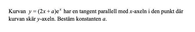y=(2x+a)exy=(2x+a)e^x. Jag tror du har ett deriveringsfel. Du måste använda produktregeln.