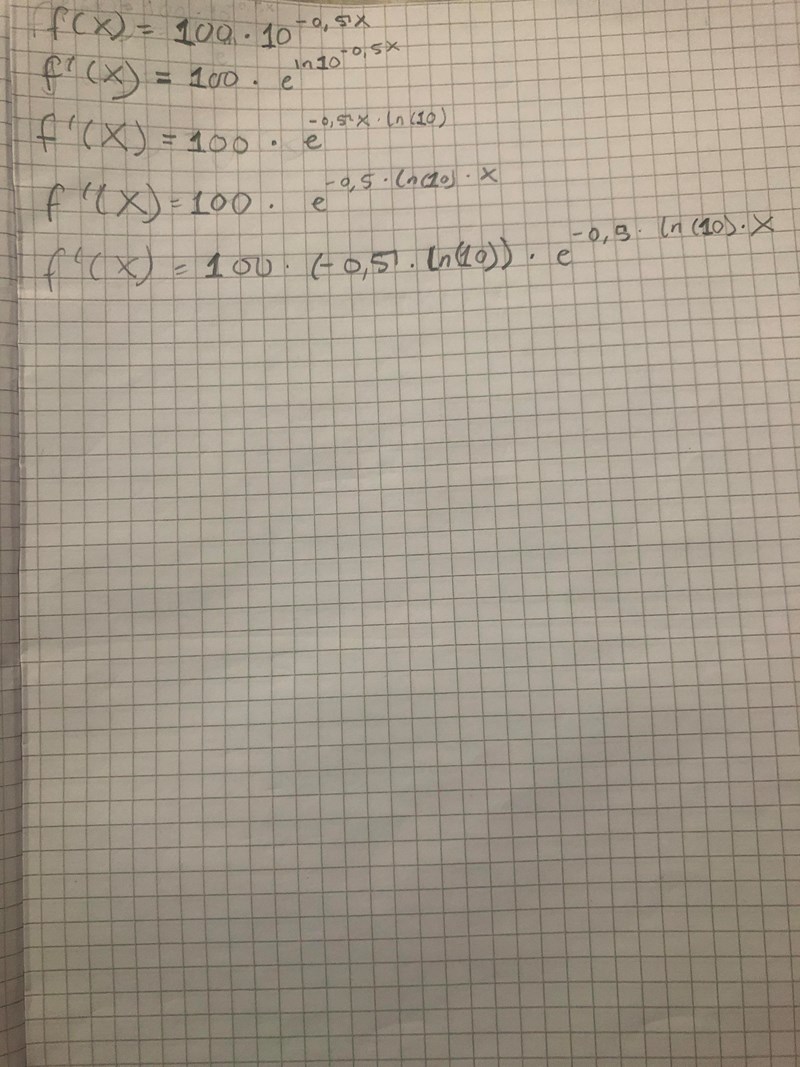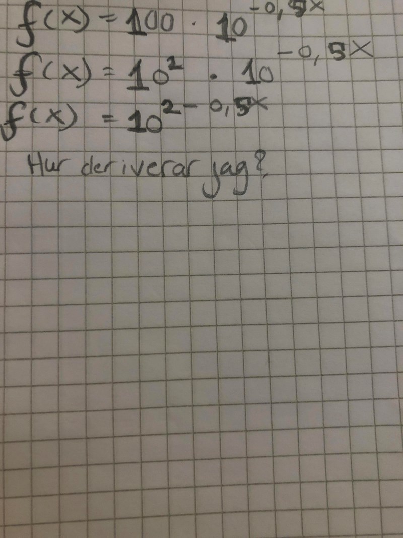 Derivatan till funktionen f(x) = 100* 10^(-0.5x)