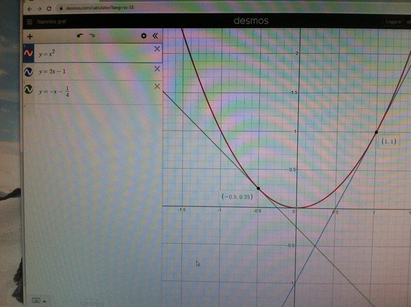 Den gröna linjen är derivatan i punkten (-0,5;0.25)