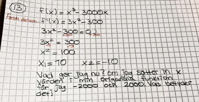 Nu behöver du bara ta reda på om vardera punkt är en maximi-, minimi-, eller terrasspunkt. Gissningsvis har du inte börjat med andraderivata än, så du skulle förslagsvis kunna testa att göra ett teckenschema för att ta reda på det