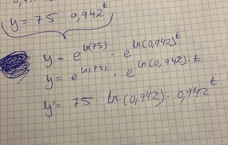 Ser inget större fel. Notera bara att 75 är konstant, så den behöver du inte åtgärda på något sätt. Jag önskar mig en parentes om e^ln(0,942) i andra raden, men du har hanterat det rätt med inre derivata.