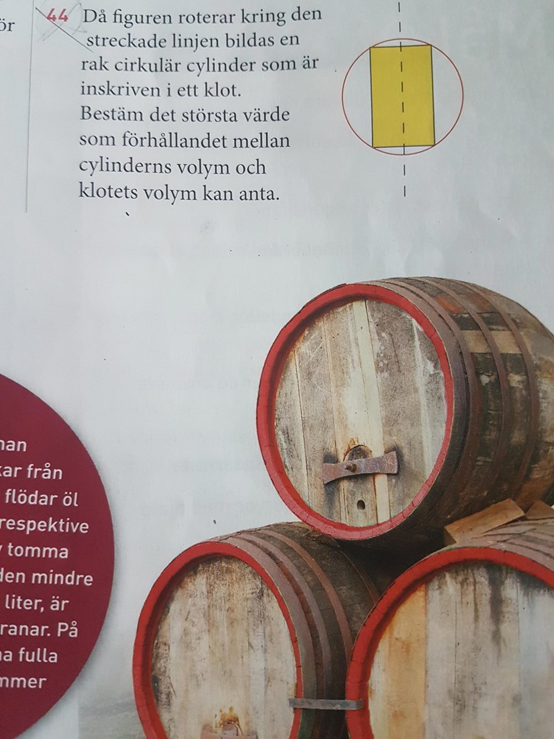 Dela cylinderns volym med klotets, du borde då få en funktion som bara innehåller fi som variabel. Bestäm max får denna.
