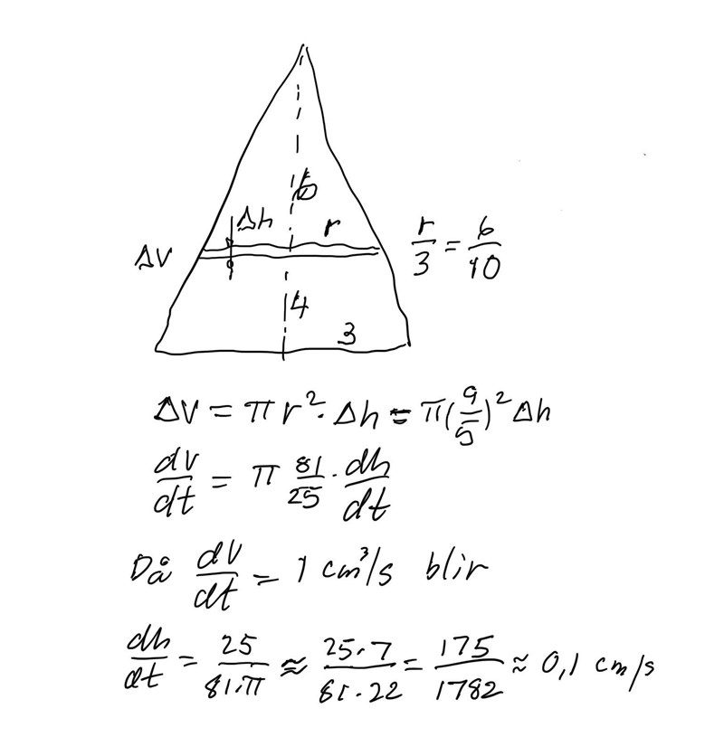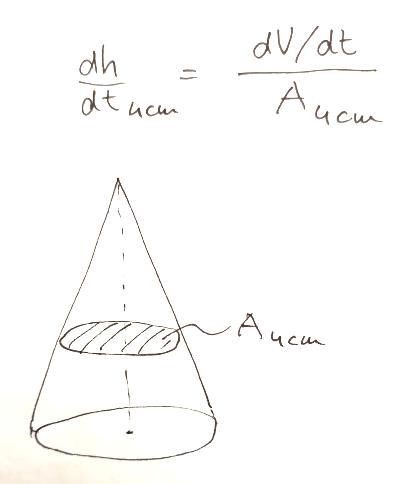 Min första tanke var att tillämpa förändringshastigheter, typ dV/dt, men det verkade inte funka. Man får ju volymen av sanden genom att ta volymena av hela konen - volymen av konen på toppen.