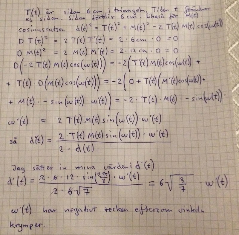 Vilket ger w’ = - 11pi/6 rad/h, som ger ett d’ i överensstämmelse med facit, fast med rätt tecken.