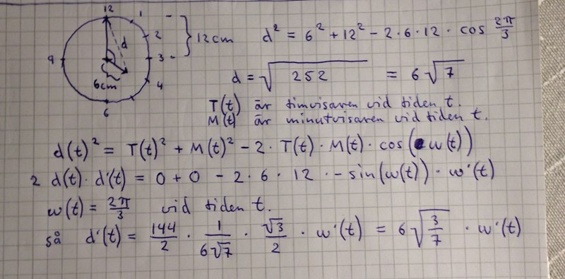3.46) Timvisaren på ett väggur är 6 cm lång och minutvisaren är 12 cm lång. Hur snabbt ändras avståndet mellan visarnas spetsar när klockan är 4?