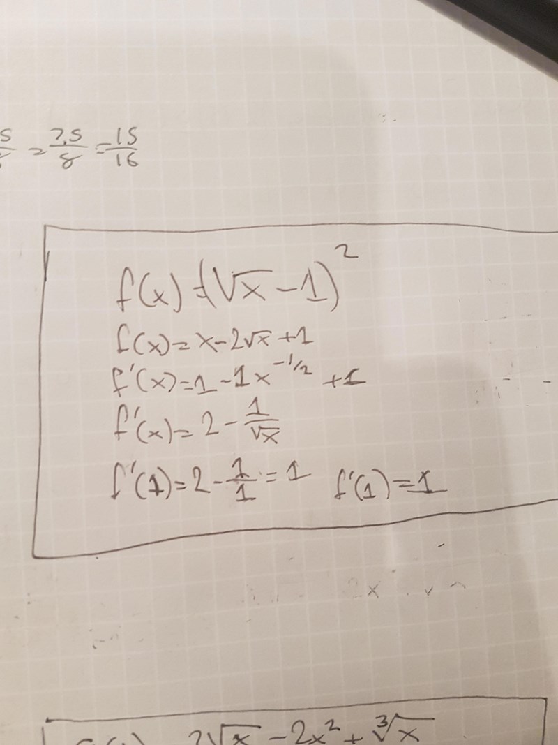 Man ska alltså räkna ut derivatan på funktionen överst om x=1. Jag får derivatan till 1, men i facit är svaret 0. Jag hade uppskattat om någon bara kunde säga var det är jag gör fel.