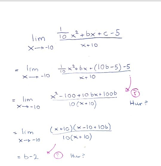 Jag ska låta x gå mot -10, jag har skrivit av lösningen till uppgiften men förstår inte två saker som de har gjort med förenklingen.Från det jag har dragit en rosa pil till , förstår jag inte hur de förenklade , hur blev (1/10*x^2+bx+c-5)/x+10 till
