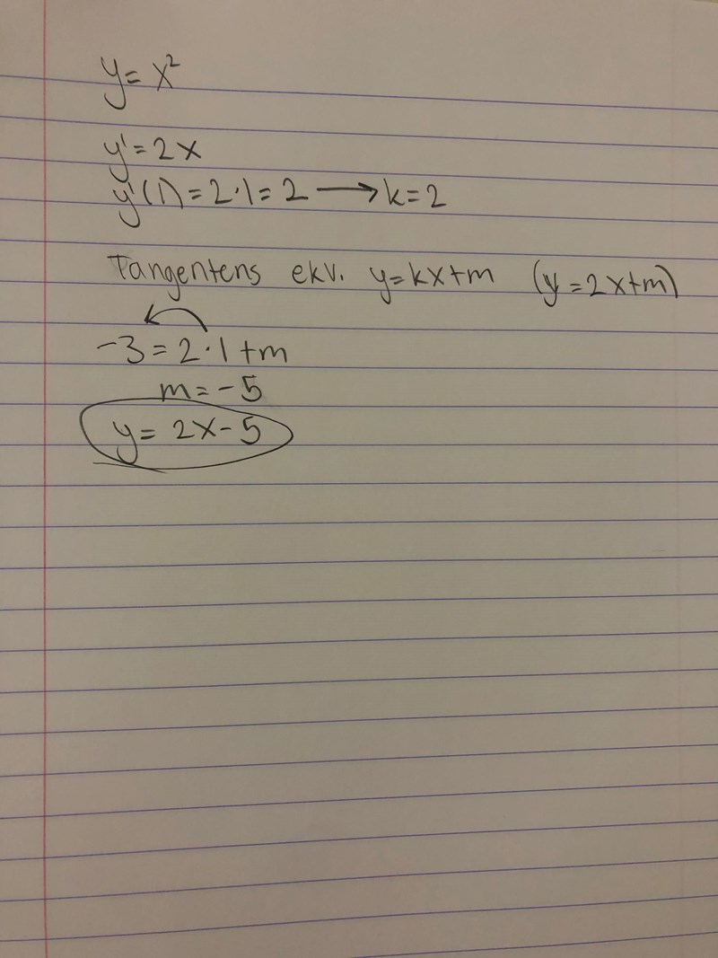 Nja inte helt OK. Notera att (1, -3) inte är tangeringspunkt. Dess x-koordinat måste du bestämma via en ekvation.