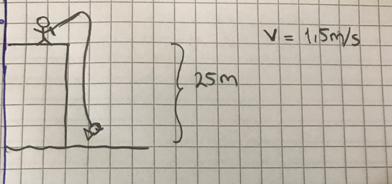 En fiskare befinner sig på en klippa 25 m över vattennivån. Han vevar in fisken med hastigheten 1,5 m/s. Hur snabbt rör sig fisken då linan är 40 m.