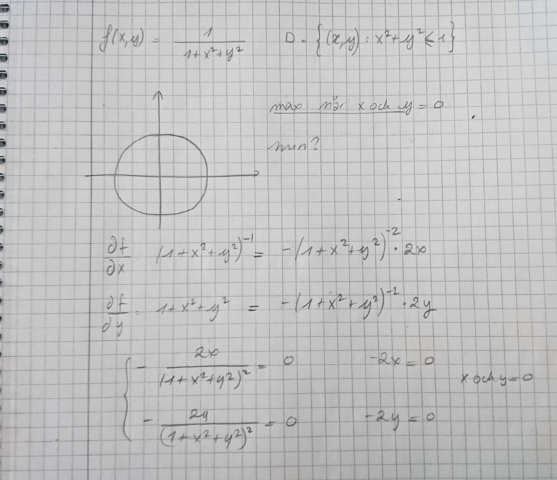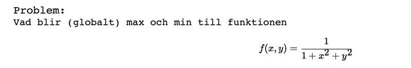 Här ser man att nämnaren är ≥ 1 för alla x och y och = 1 bara i (0,0), så någon andraderivata behövs inte.