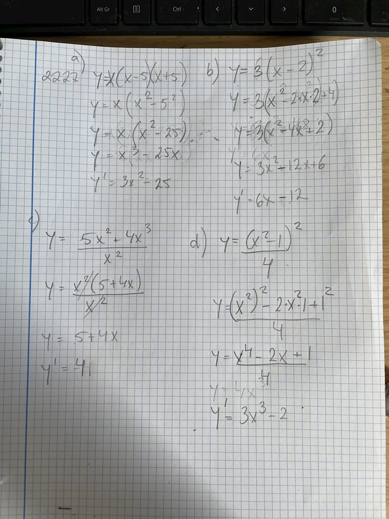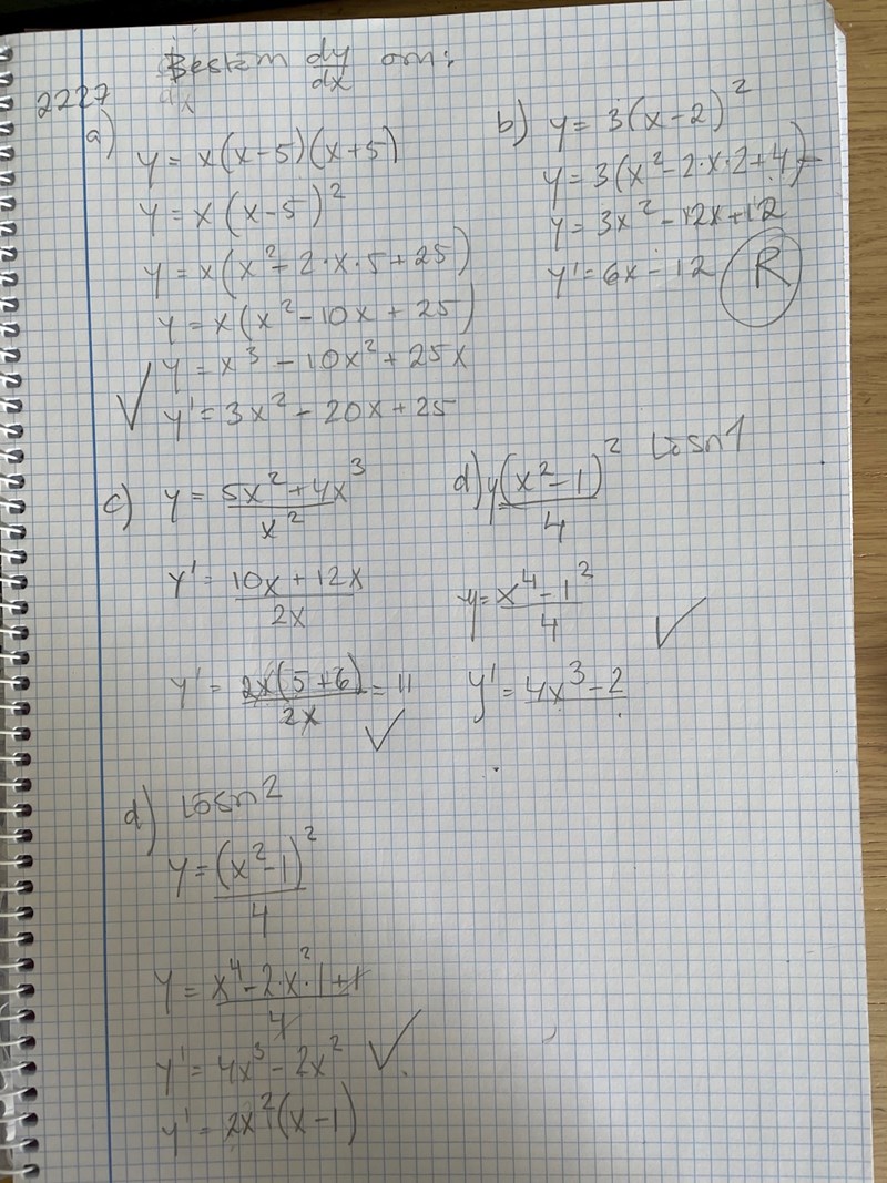 På 2227c) förstår jag inte riktigt vad som händer. Du kan inte bara derivera sådär. För att kunna utnyttja den deriveringsregeln på en term måste den stå på formen . Du borde alltså börja med att bryta ut ur täljaren och dela bort den.