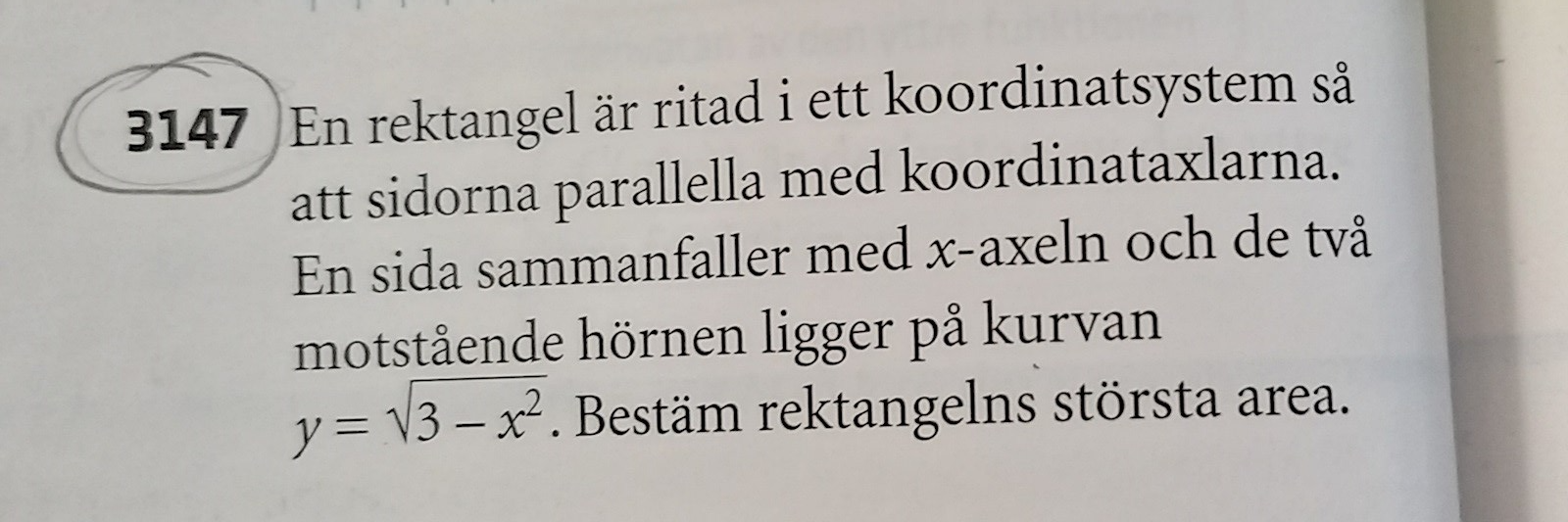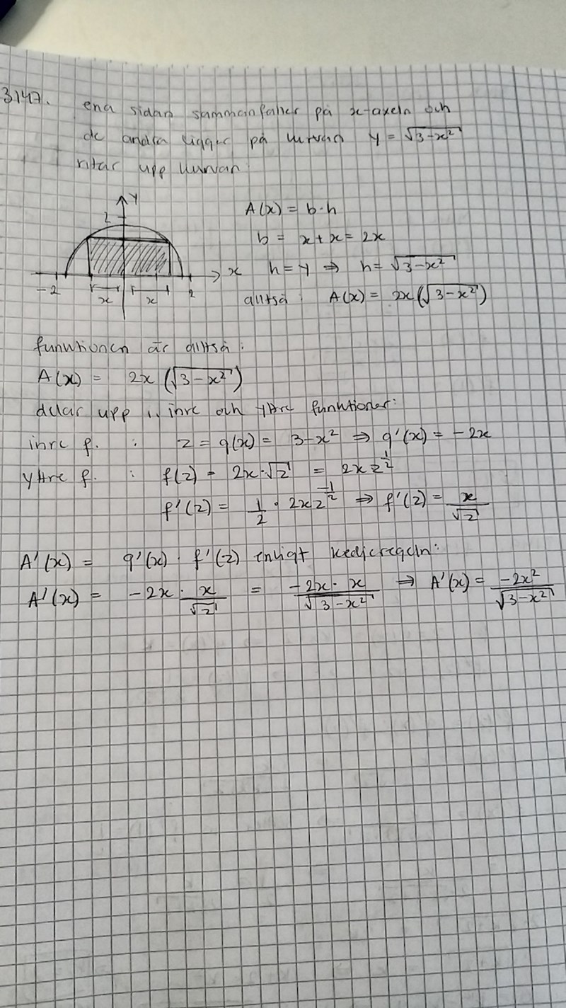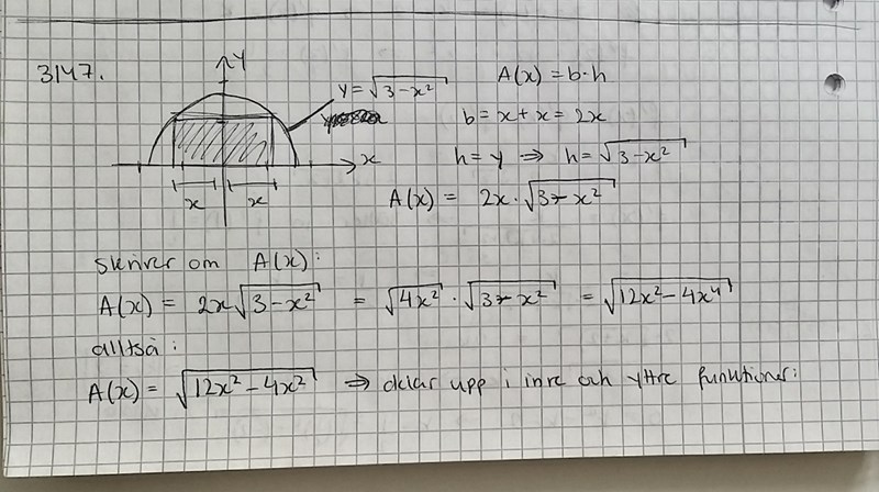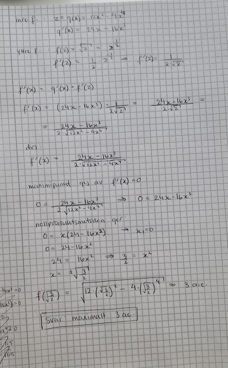 Undrar hur jag ska göra nu, för att hitta största arean tar man ju A'(x) = 0 och sedan kontrollerar maximivärdet med andraderivatan och till sist sätter jag in maximivärdet i funktionen, men hur ska jag ta andraderivatan av en sammansatt funktion (har inte gått igenom andra deriveringsregler för mer komplexa funktioner än)? Har jag ens gjort rätt eller finns det en smidigare metod?