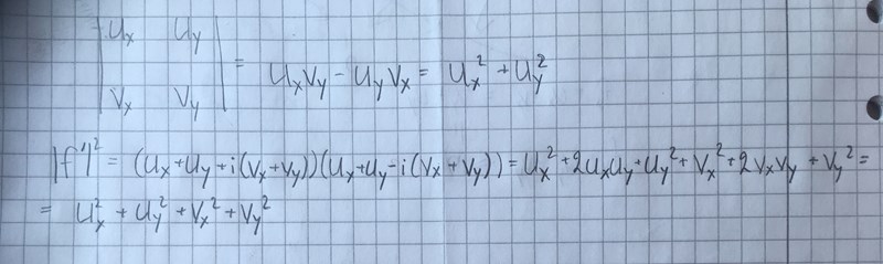 Satt med den här och började räkna ut vad man kunde göra med alla u och v, och insåg sen att jag inte vet vart jag är påväg. Vad är egentligen f’ , alltså i u och v. Skulle gissa på typ ux +uy + ivx +ivy, men så många ^2 går väl inte få från den matrisen?