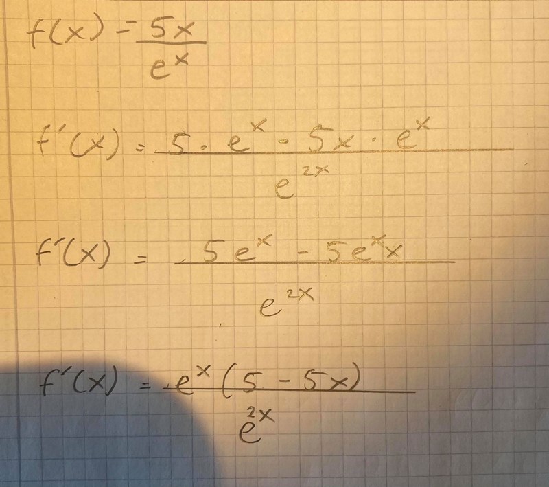 Jag har nästan löst detta problem, jag har kommit så här långt men vet inte vad jag ska göra sedan, för vet inte riktigt om e^x kan förkortas med nämnaren, blir tacksam för hjälp!