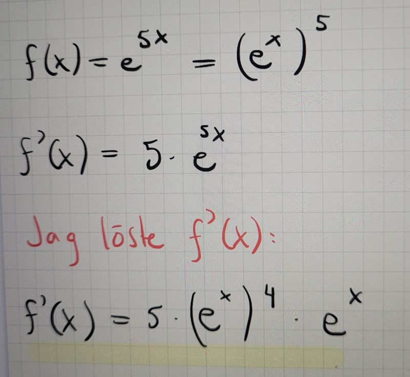 Är det fel? Det gula är 5(e^4x)e^x = 5e^(4x+x) = 5e^(5x)
