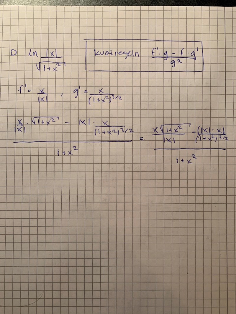 Om du har funktionen ln(|x|/sqrt(1+x^2)) så kan du ju utnyttja att ln(a/b)=lna-lnb.