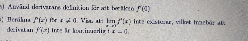 På den första la jag bara in x=0 i derivatan vilket blir odefinierat då det är disvion med noll men det står att man ska räkna med derivatans definition har jg gjort fel då ? Har använt mig av produktregel bland annat.