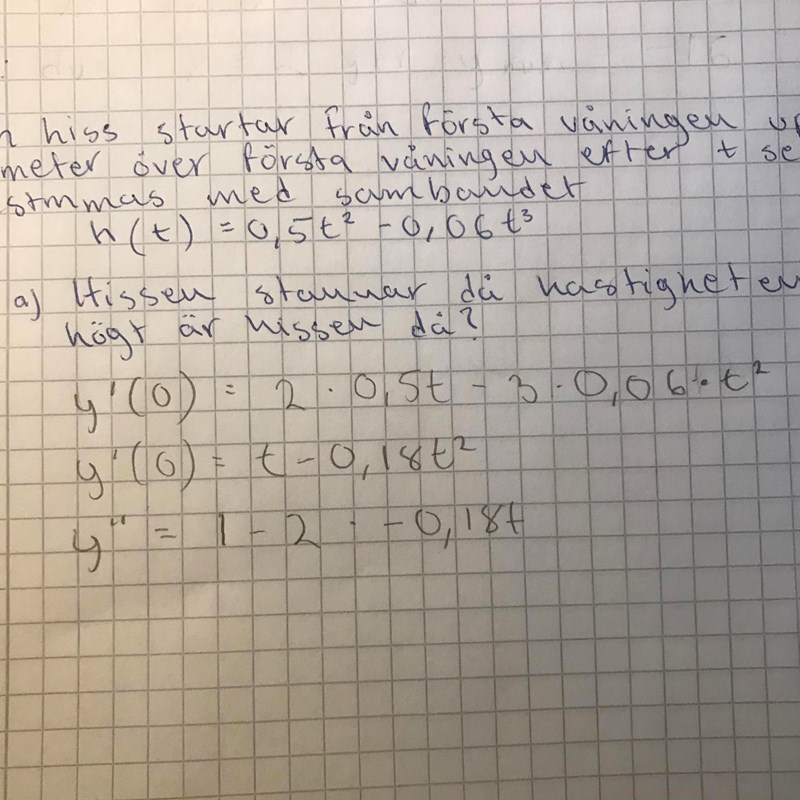 En hiss startar från första våningen uppåt. Höjden h i meter över första våningen efter t sekunder kan bestämmas med sambandet