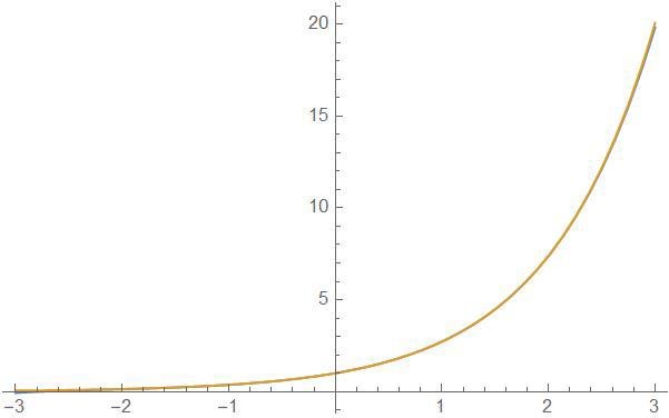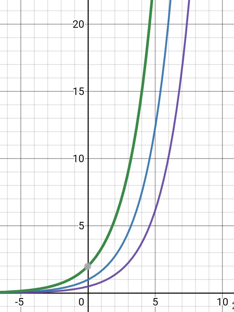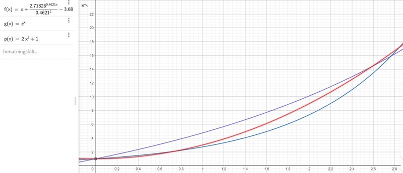 Nedan har jag ritat in mina tre grafer. Målet var att få en som var nära f(t) = ex