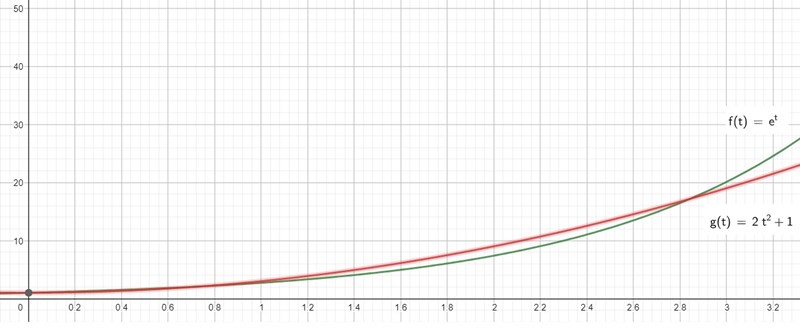På det viset letade jag upp grafen g(t) = 2t2 + 1, som man kan se i diagrammet ovan så ligger de två hyfsat nära varandra.