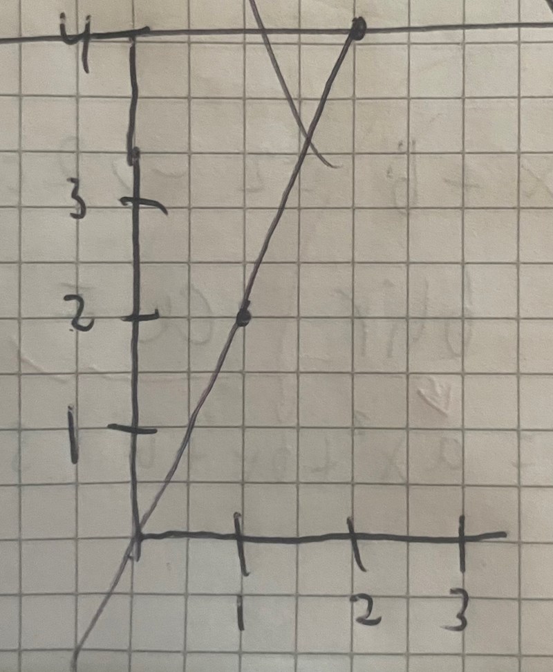 - Du vet att grafens lutning vid x = 1 är lika med 2. Rita därför ett kort streck med lutning 2 vid x = 1 och lite ovanför y = 1.