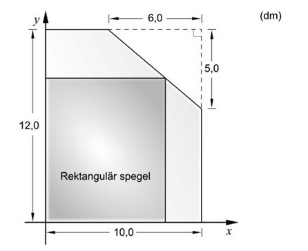 En glasmästare har skurit av ett hörn på ett rektangulärt spegel som hade måtten 12 x 10 dm. Den avskurna biten har formen av en rätvinklig med sidorna är 6 resp 5 dm. Beräkna det mått på bredden som ger spegelns största area
