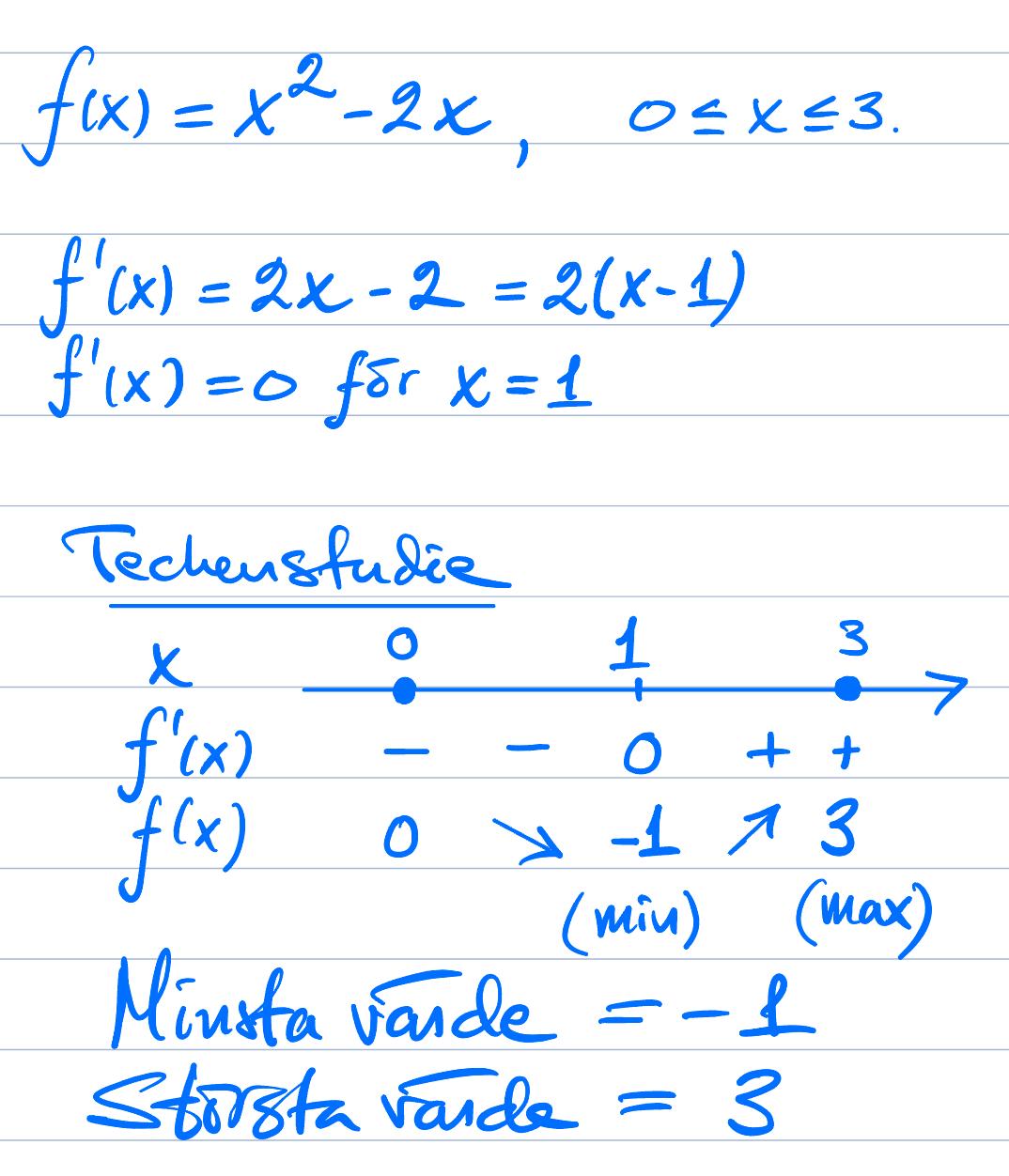 Bestäm med hjälp av derivata det största och minsta värdet som funktionen kan ha i det givna intervallet.