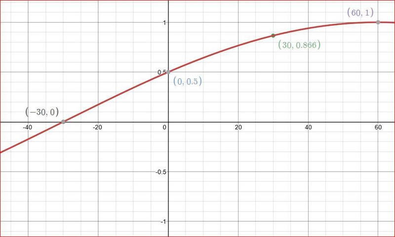 • Om x = 60 så är g(60) = sin(60+30) = sin(90). Det betyder att grafen ska ha höjden sin(90)=1 vid x = 60.