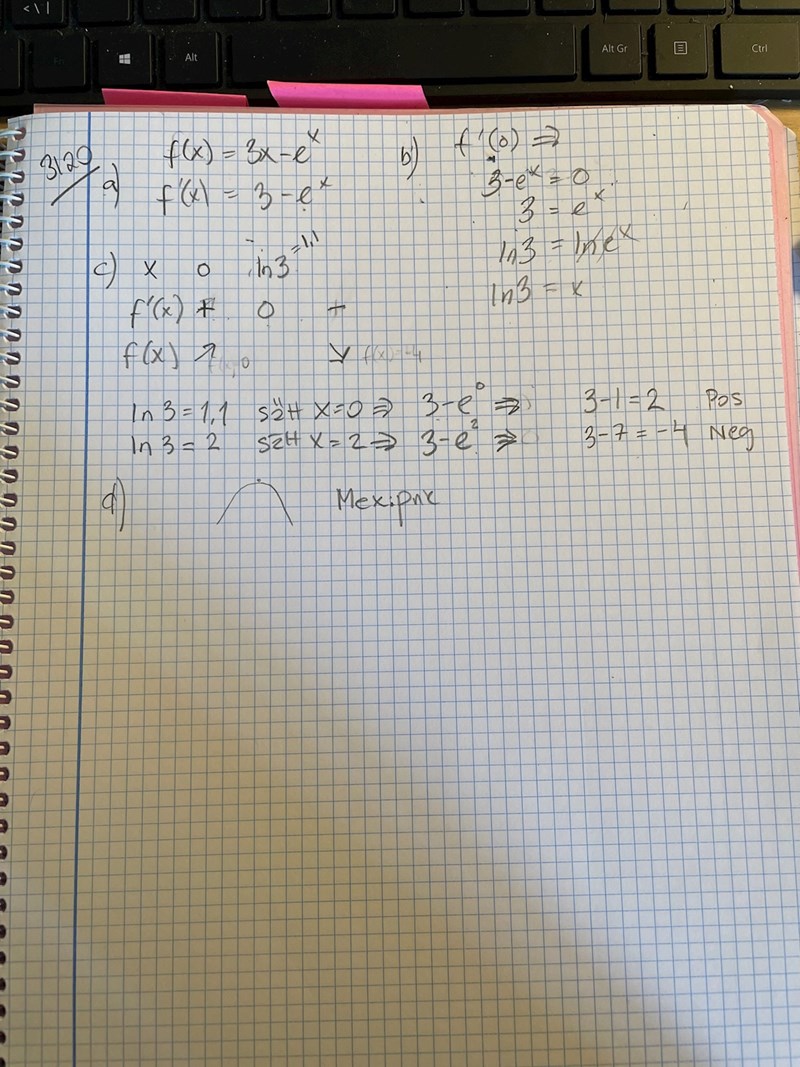 i c) står också ln 3 = 2 på ett ställe, tanken är väl att testa x=2 som det står på samma rad.