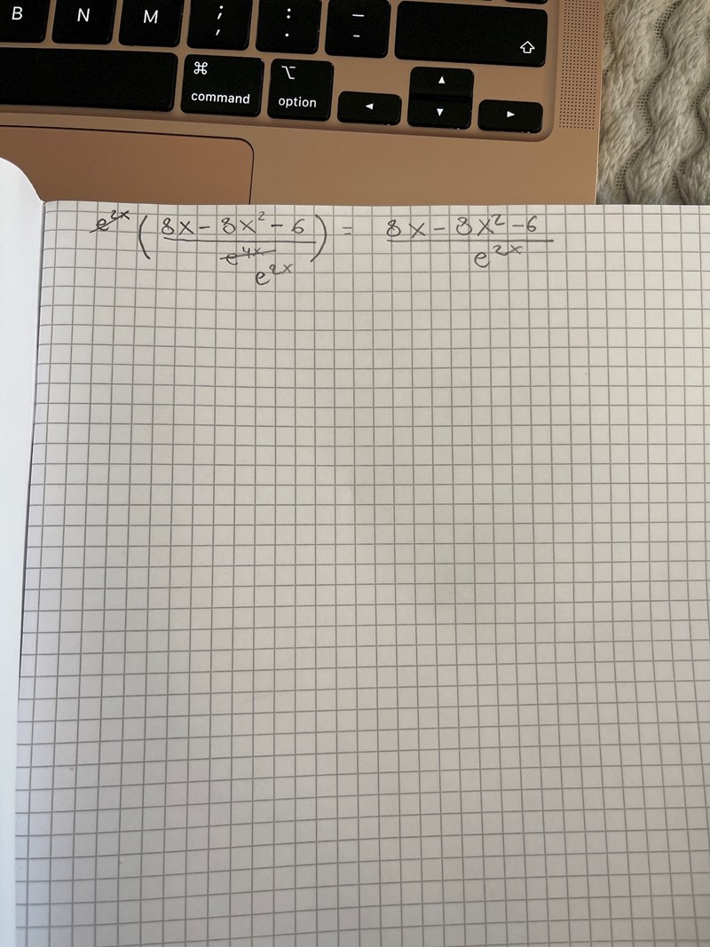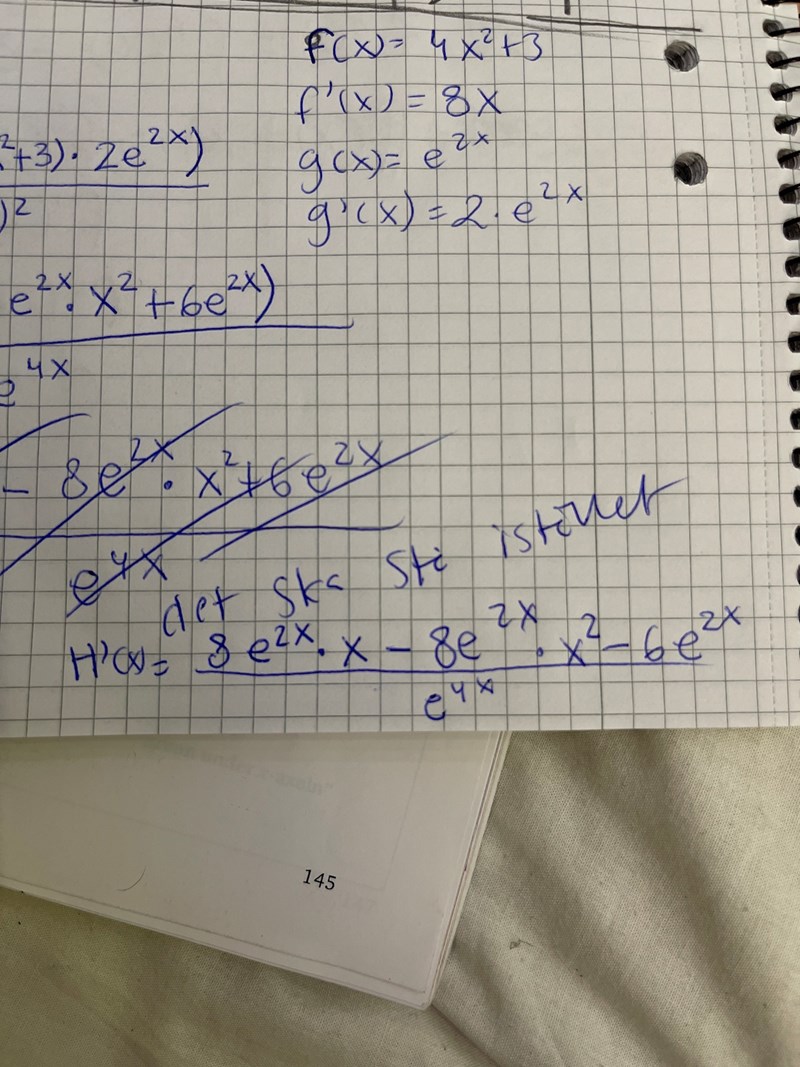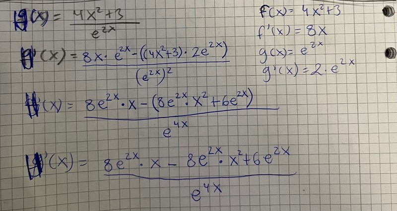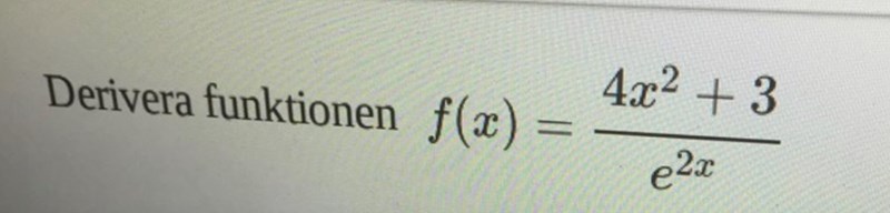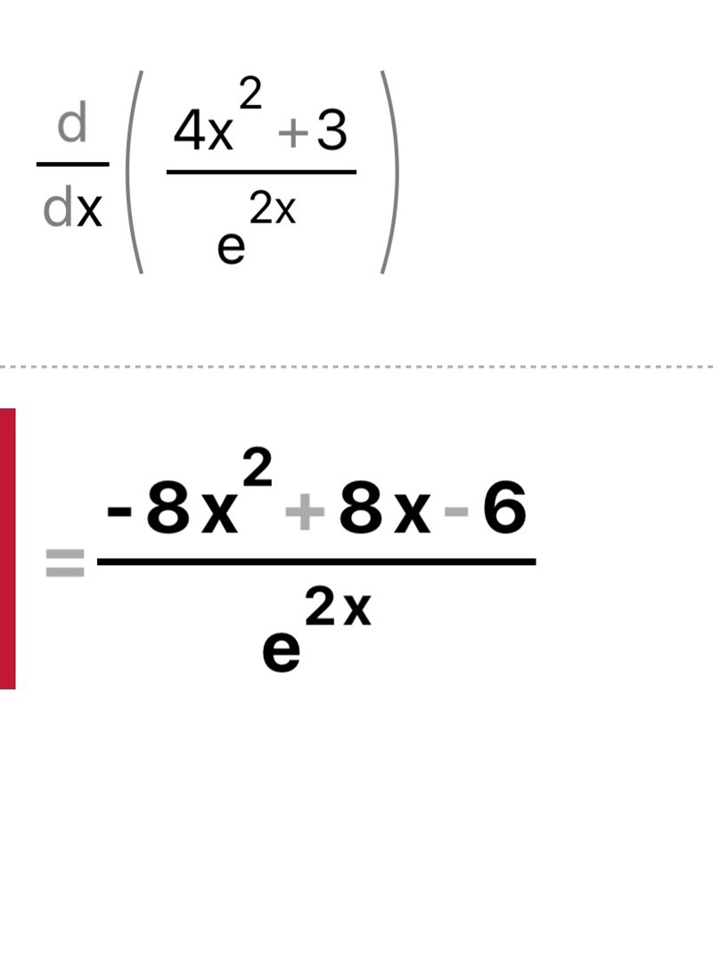 Vet inte om det är just det felet du menade men det ska stå ”-6e^2x” i täljaren inte ”+6e^2x”