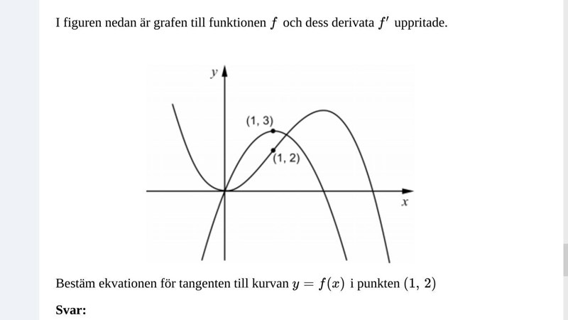 Vilken av graferna visar f(x)? Vad visar den andra grafen? Rita en tangentlinje till f(x) i (1,2). Vilken ekvation beskriver denna linje? :)
