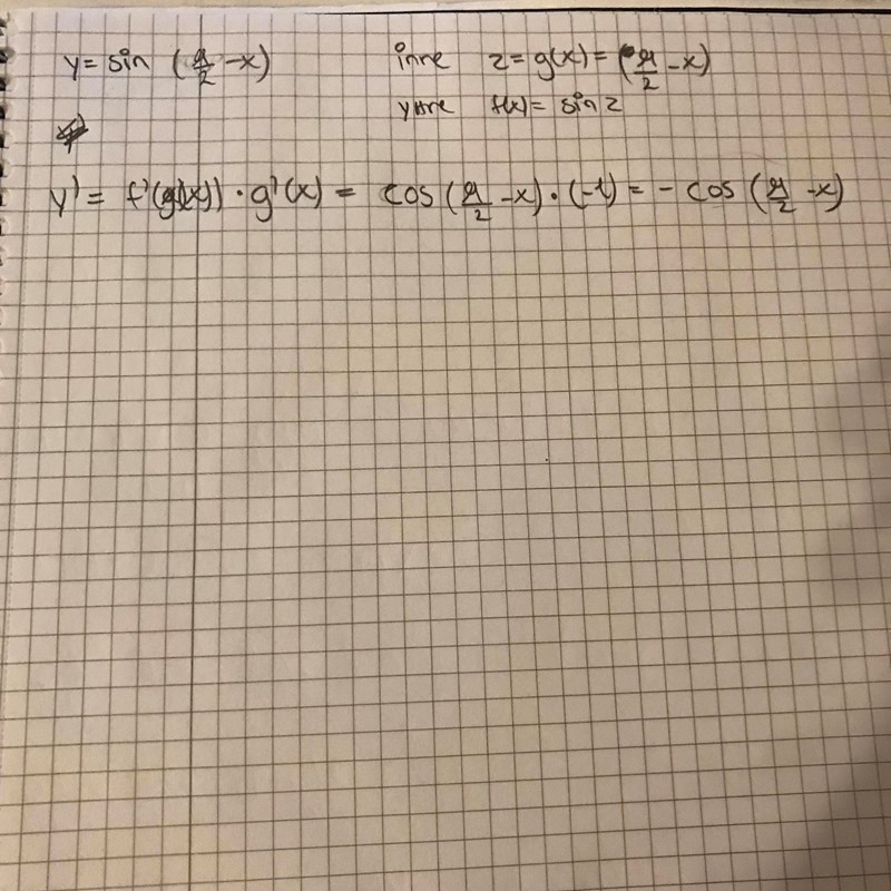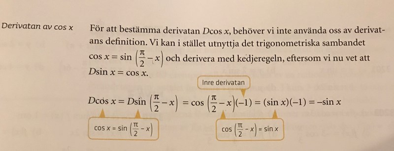 Hej, jag förstår ibte hur de har kommit fram till att Dcos x = - sin x ... Jag har hängt med framtills dess att de börjat multiplicera med -1. Jag förstår inte varför.