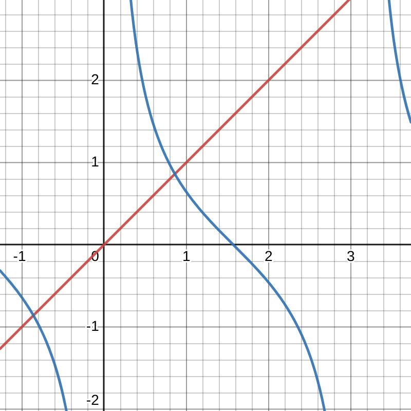 Beräkna värdet för 1/tan(0,85). Det är ungefär 0,88, alltså större än 0,85, så vi är för långt åt vänster.