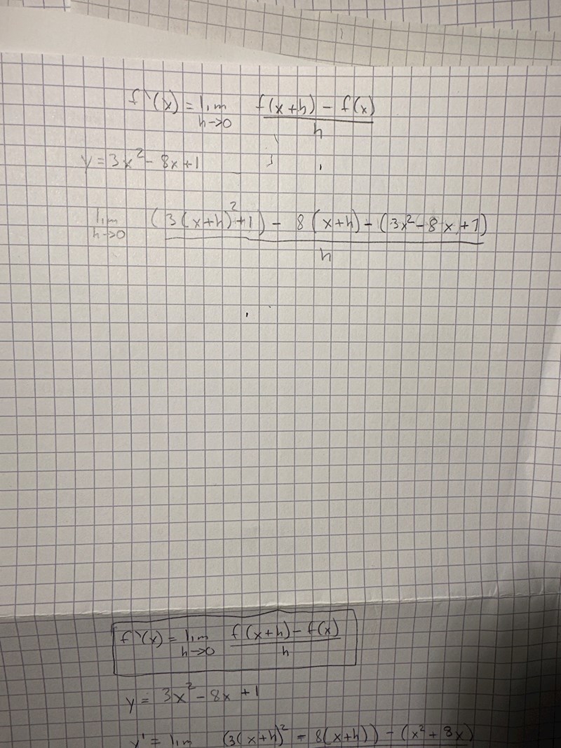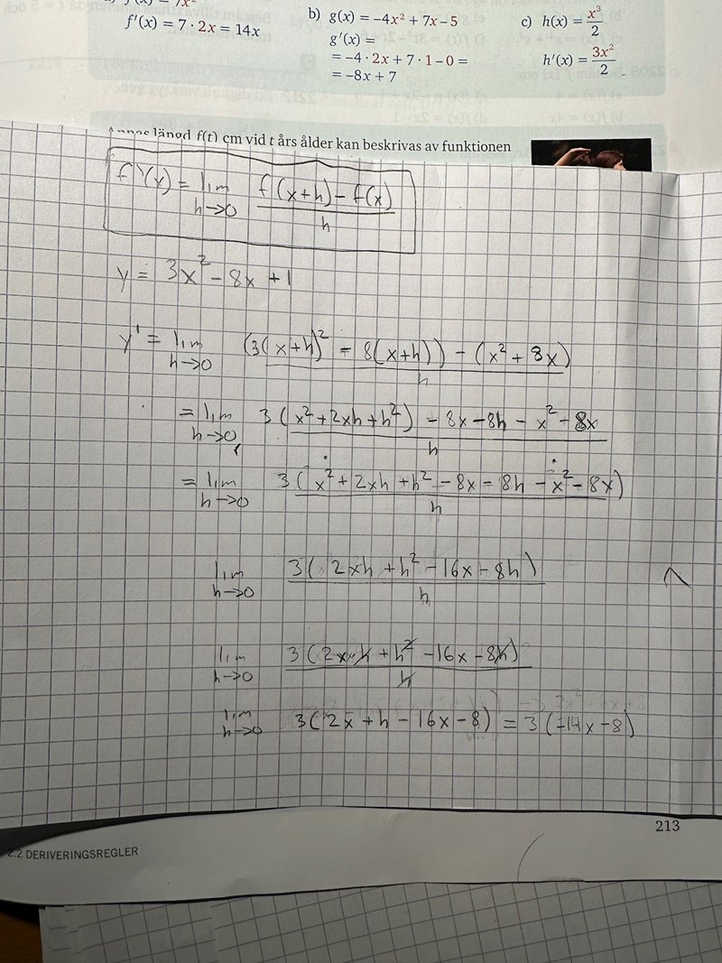 Ett bra tips är att börja med att göra en "faktaruta" som innehåller ett uttryck för y(x) och ett uttryck för y(x+h).