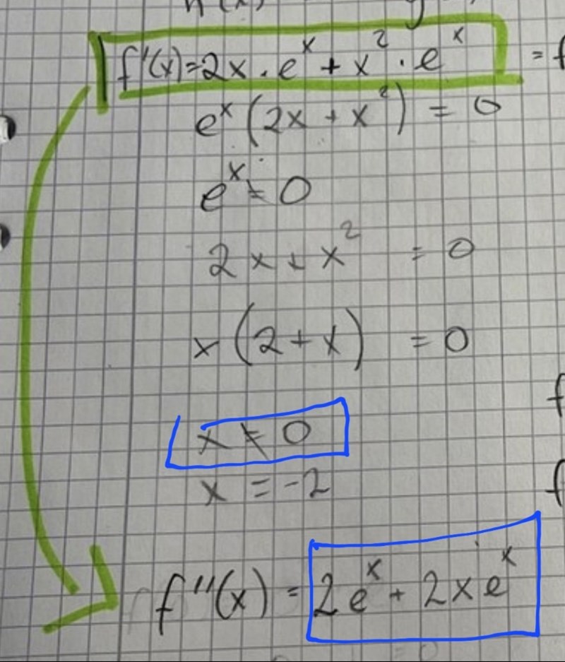 Mitt svar på f``(-2) får jag till -2e-2. (se bild) men i en annan lösning får de bara -e-2 och jag kan verkligen inte förstå hur det kan bli så. Någon vänlig själ som kan hjälpa mig att förstå vad jag gör för fel samt hur jag går vidare härifrån och gör de nödvändiga beräkningarna för att svara på frågan om extrempunkter?