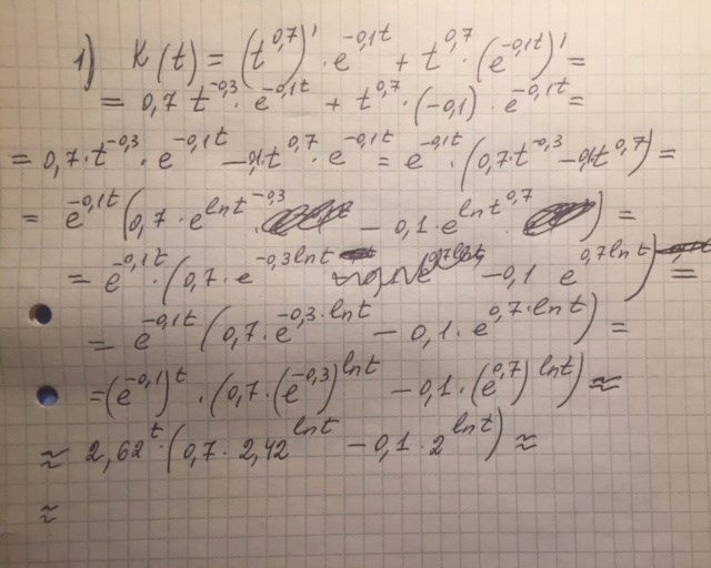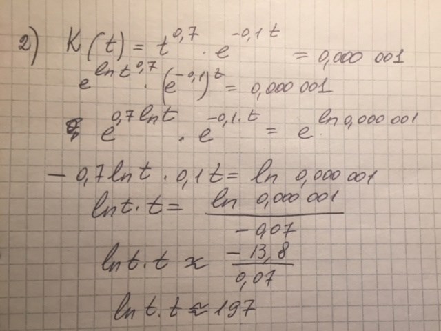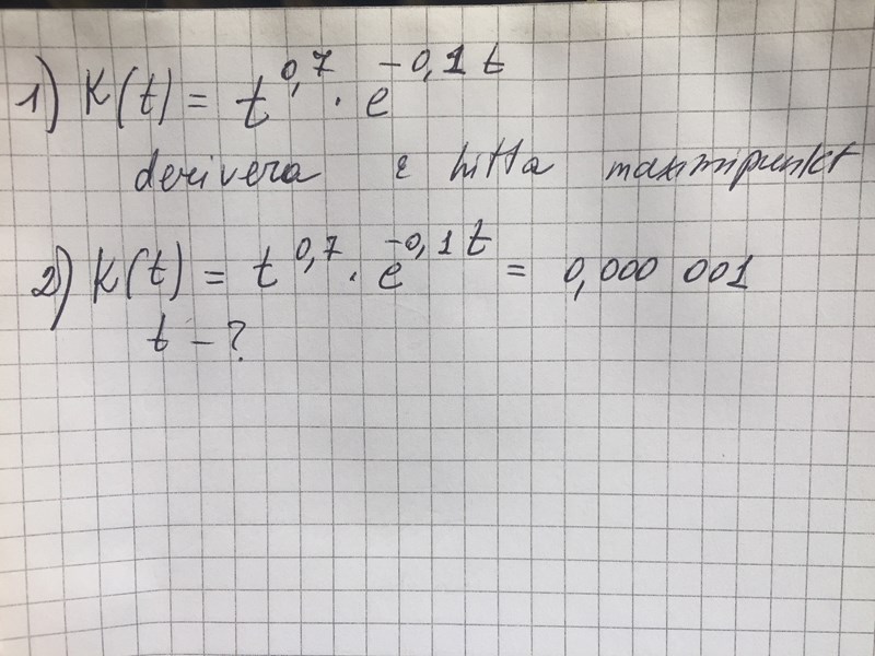 Derivatan till funktionen K(t) med talet e och värde på t när K(t)=0, 000 001