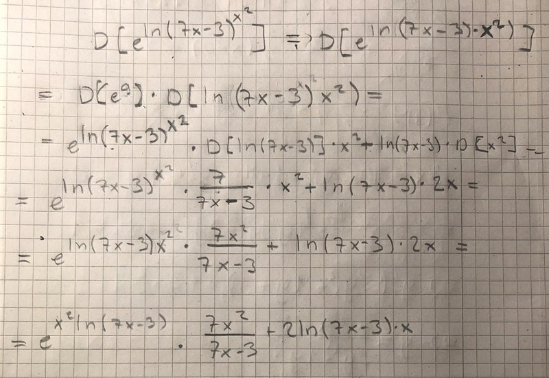Den yttre funktionen är väl e^x och den inre funktionen ln(7x-3)*x^2. Ska man använda produktregeln då?
