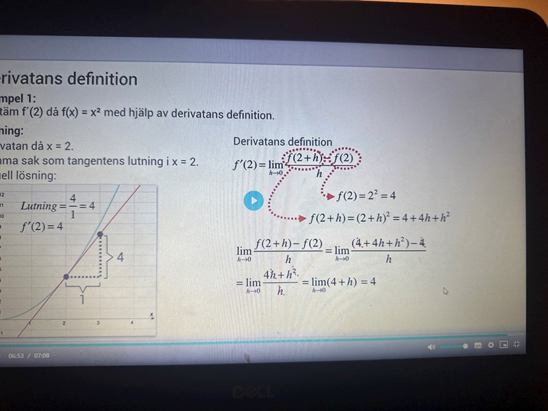 Derivatans definition ger egentligen lutningen av en sekant där en av punkterna är den punkt man vill veta lutningen i (här x=2) och den andra är en godtycklig punkt på kurvan. Avståndet mellan punkterna benämns h och krymps avståndet mellan de två punkterna kommer man tillslut få lutningen i endast punkten man är intresserad av (här x=2). lim h -> 0 visar att avståndet mellan punkterna blir oändligt litet.