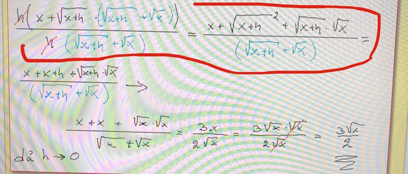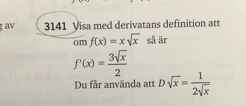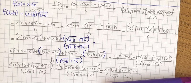 Försöker visa med derivatans definition att om f(x)=x*roten ur x så är f’(x)=(3*roten ur x)/(2 ). Har sett ett lösningsförslag på en webbsida men förstår inte hur man förenklar uttrycket i bilden där man varken använder kvadreringsregeln eller konjugatregeln.