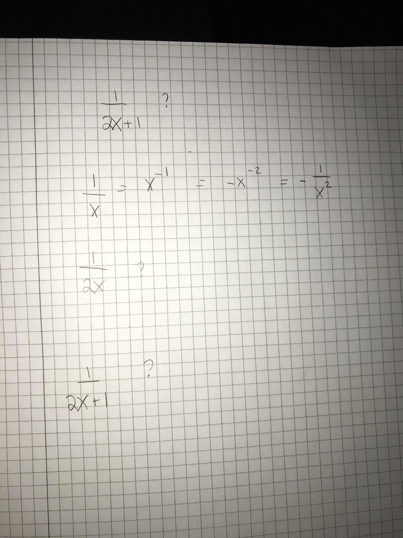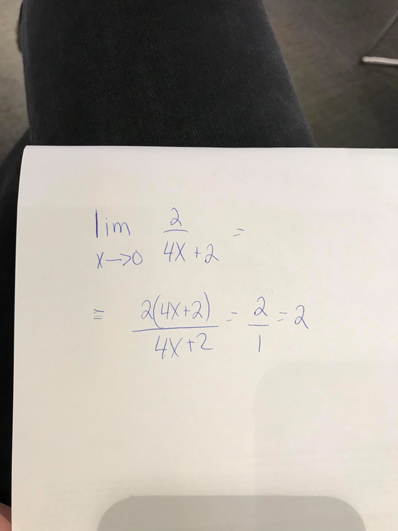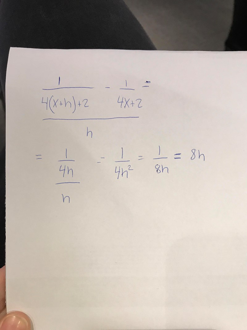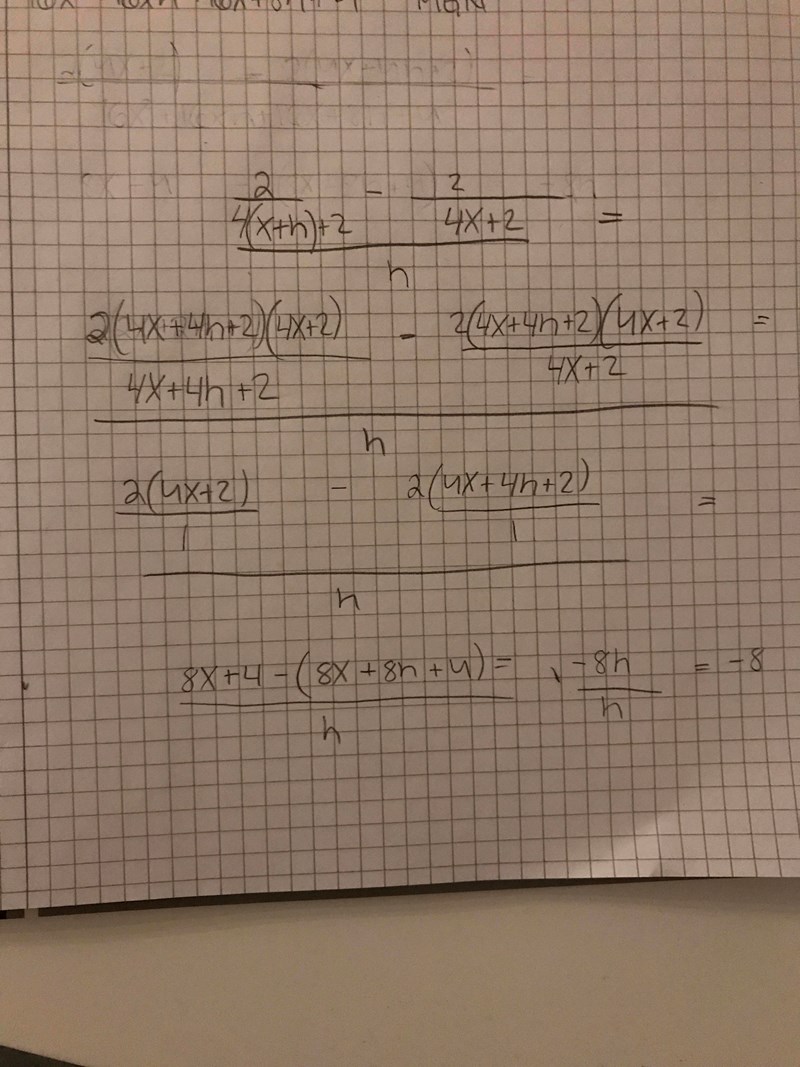 Jag tror (gissar) att du egentligen tänker rätt, men du använder fel siffror. Försök igen! De båda olika nämnarna är 4(x+h)+2 respektive 4x+2.