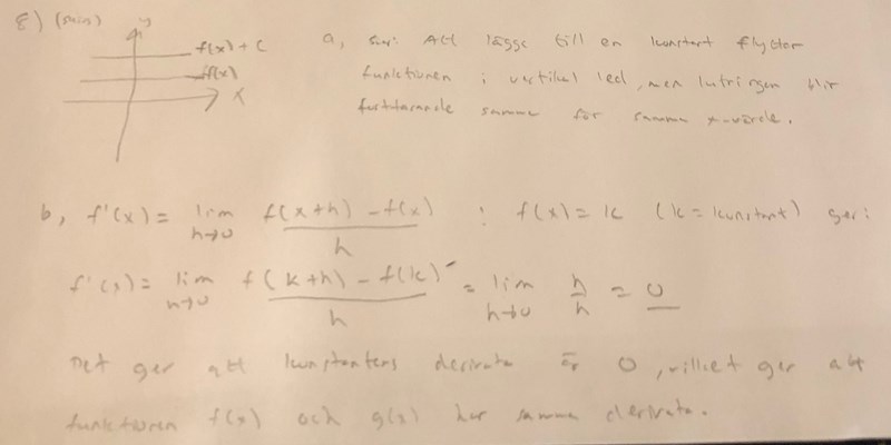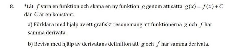 f(x) = k, menar jag att k står för konstanten, alltså om den deriveras blir den 0 som jag visar med derivatans definition och g(x) = f(x) + C, ger g'(x) = f'(x)