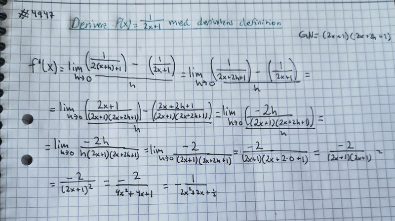 Du har ju gjort helt rätt. Skulle dock skippa sista steget och bara skriva det som -2/(2x+1)^2